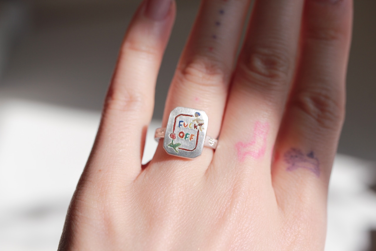 L'artiste habite au Japon, à Yokohama. Il est écrit dans la page à propos du site qu'il "crée des bijoux inspirés par des moments marquants, des émotions et ses mots préférés." "Fuck off" en fait partie apparemment. Comme je le comprends !