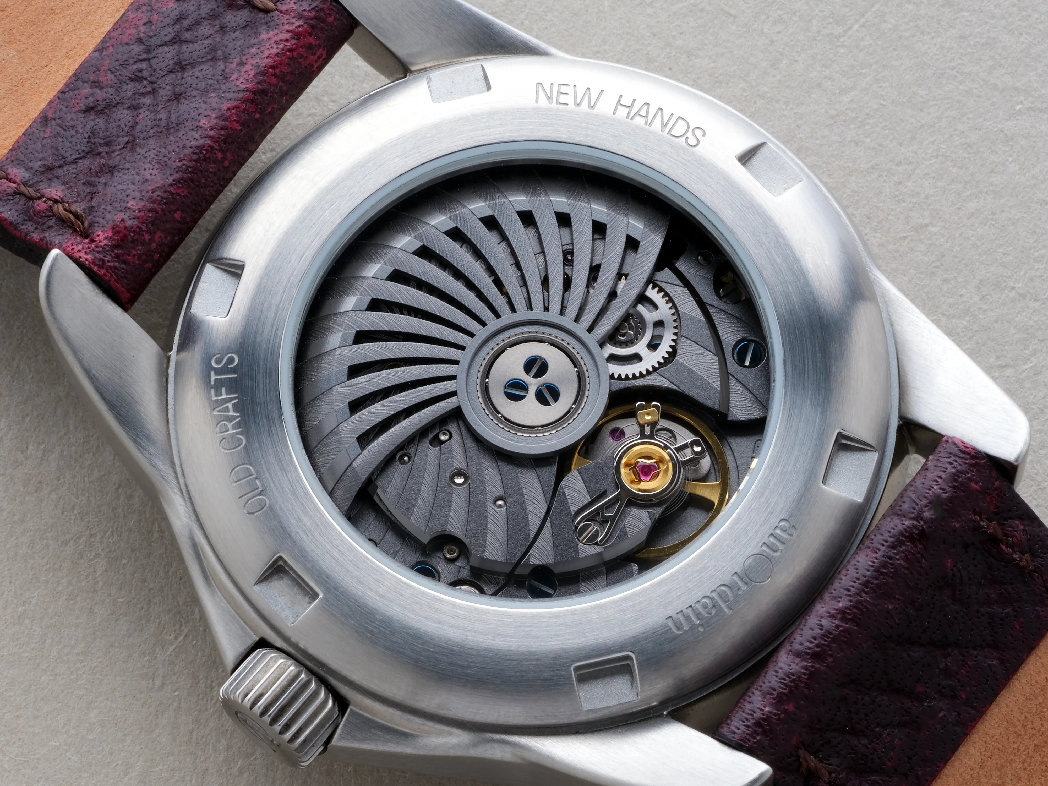 Le nom de la marque est écrit en tout petit en haut. anOrdain. On laisse de la place pour que les chiffres et les aiguilles s'exprime. On ne pollue pas visuellement l'espace de cadrans dans tous les sens. On laisse parler la matière aussi.